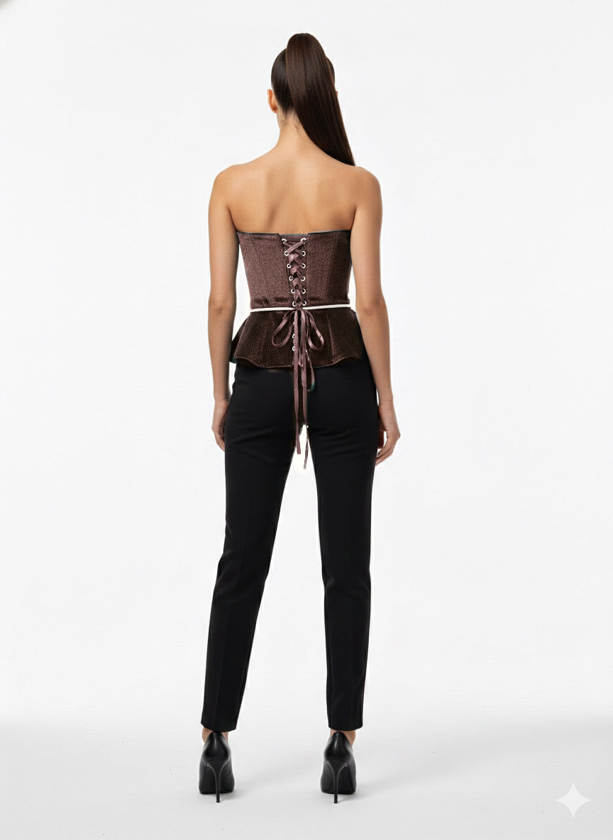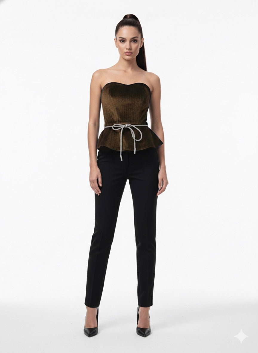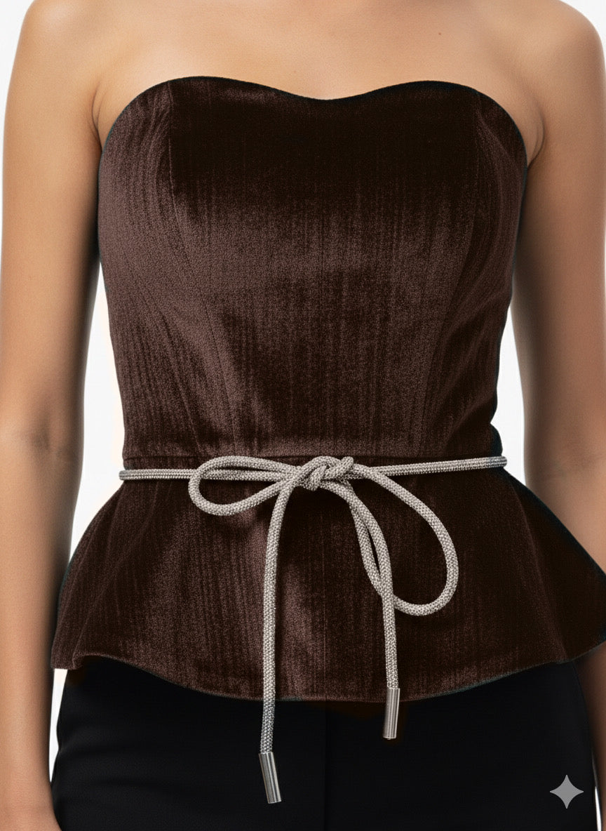 This elegant strapless brown velvet top features a sculpted bodice that beautifully highlights the neckline and shoulders. Crafted from rich velvet fabric, it offers a luxurious texture with subtle depth and sheen. The peplum-style hem creates a flattering silhouette, while the delicate rope belt at the waist adds a refined accent and adjustable fit. Designed to elevate evening looks, this piece pairs effortlessly with tailored pants or skirts for a polished, sophisticated finish.