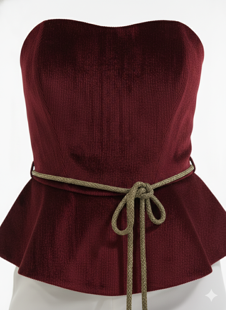 This elegant strapless top features a structured silhouette with a subtle sweetheart neckline that enhances the upper body. Crafted in a rich burgundy tone, the design is cinched at the waist with a delicate contrasting rope belt, creating a flattering peplum shape that accentuates the waistline. The textured fabric adds depth and sophistication, while the flared hem offers graceful movement. A refined statement piece, perfect for evening occasions or elevated styling when paired with tailored pants or skirts.
