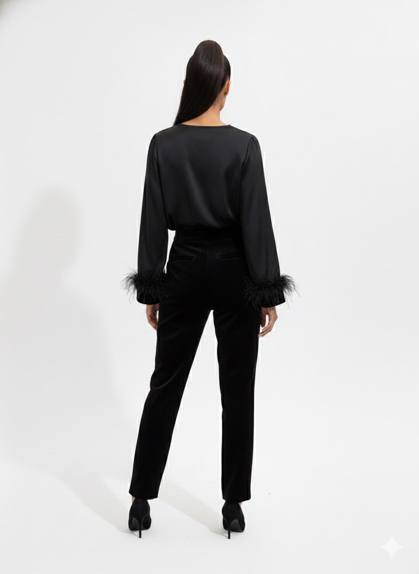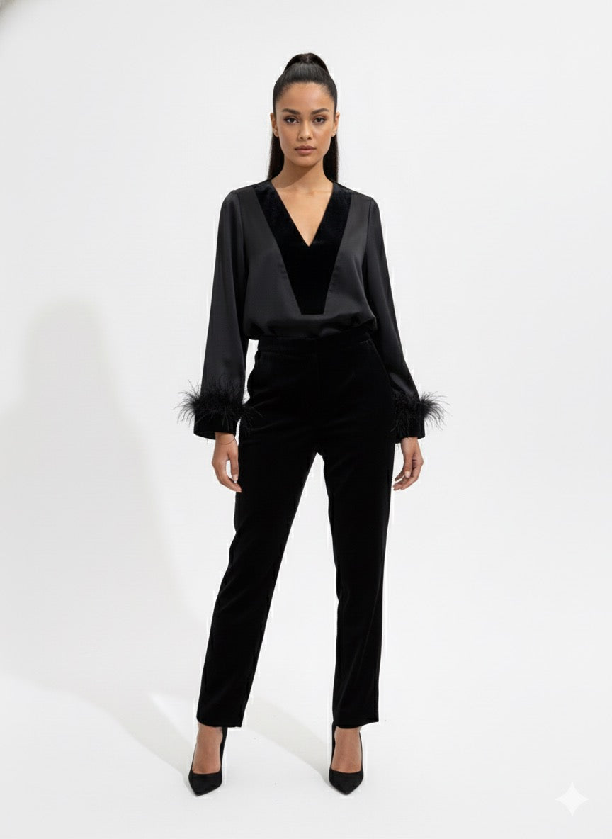 This elegant black blouse features a deep V-neckline that creates a refined, feminine silhouette. Designed with long, sheer sleeves finished with soft feather trim at the cuffs, it adds a touch of drama and luxury without feeling overdone. The fluid fabric drapes beautifully on the body, making it an ideal choice for evening events, formal occasions, or elevated styling with tailored pants or skirts. A statement piece that balances sophistication with modern allure.