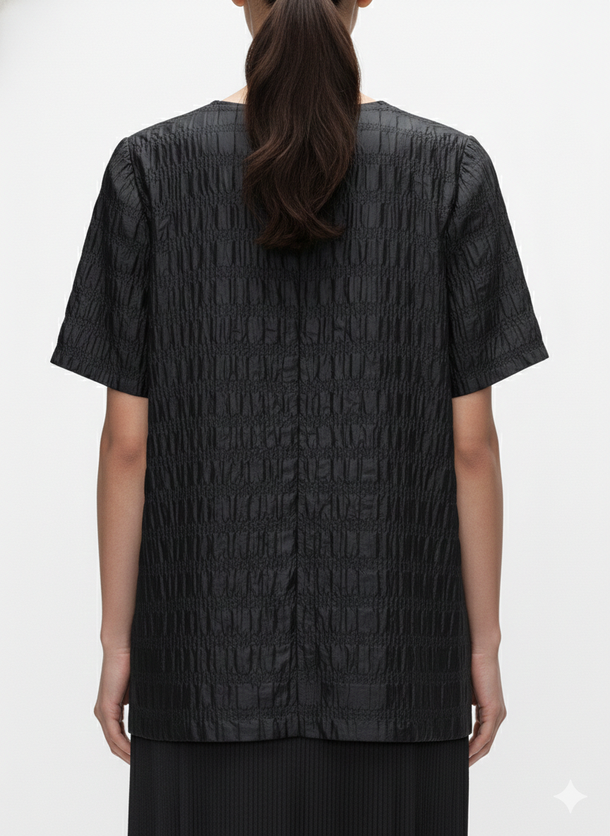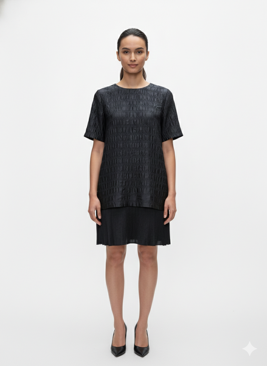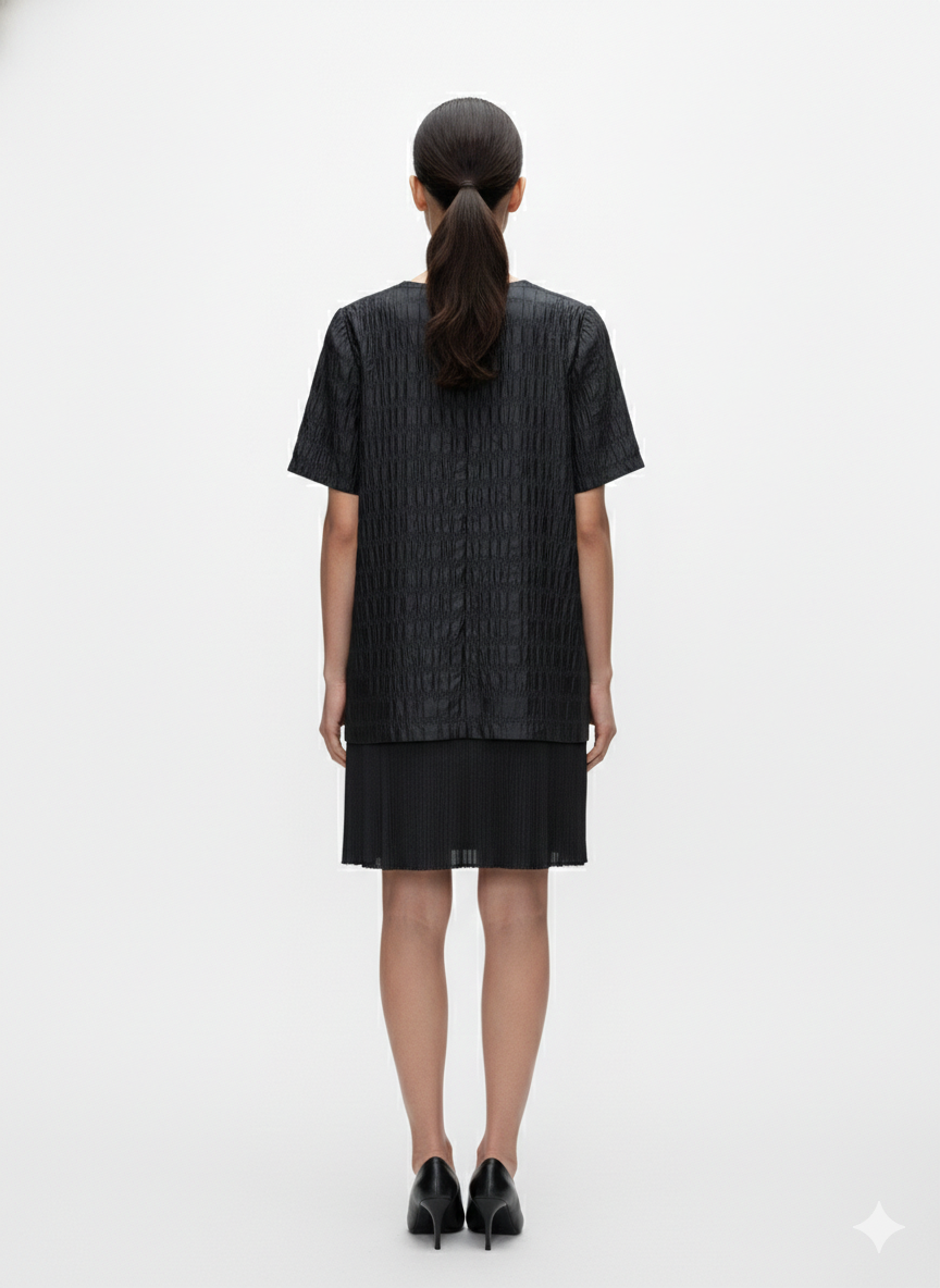This refined black pleated dress features a modern layered silhouette that blends structure with movement. Designed with a relaxed straight cut and short sleeves, the upper layer offers a textured finish that adds depth and dimension to the look. The softly pleated lower layer creates subtle flow with every step, giving the dress a balanced and sophisticated feel. Minimal yet distinctive, this piece is perfect for both professional settings and elevated everyday styling.
