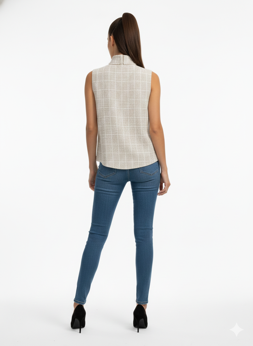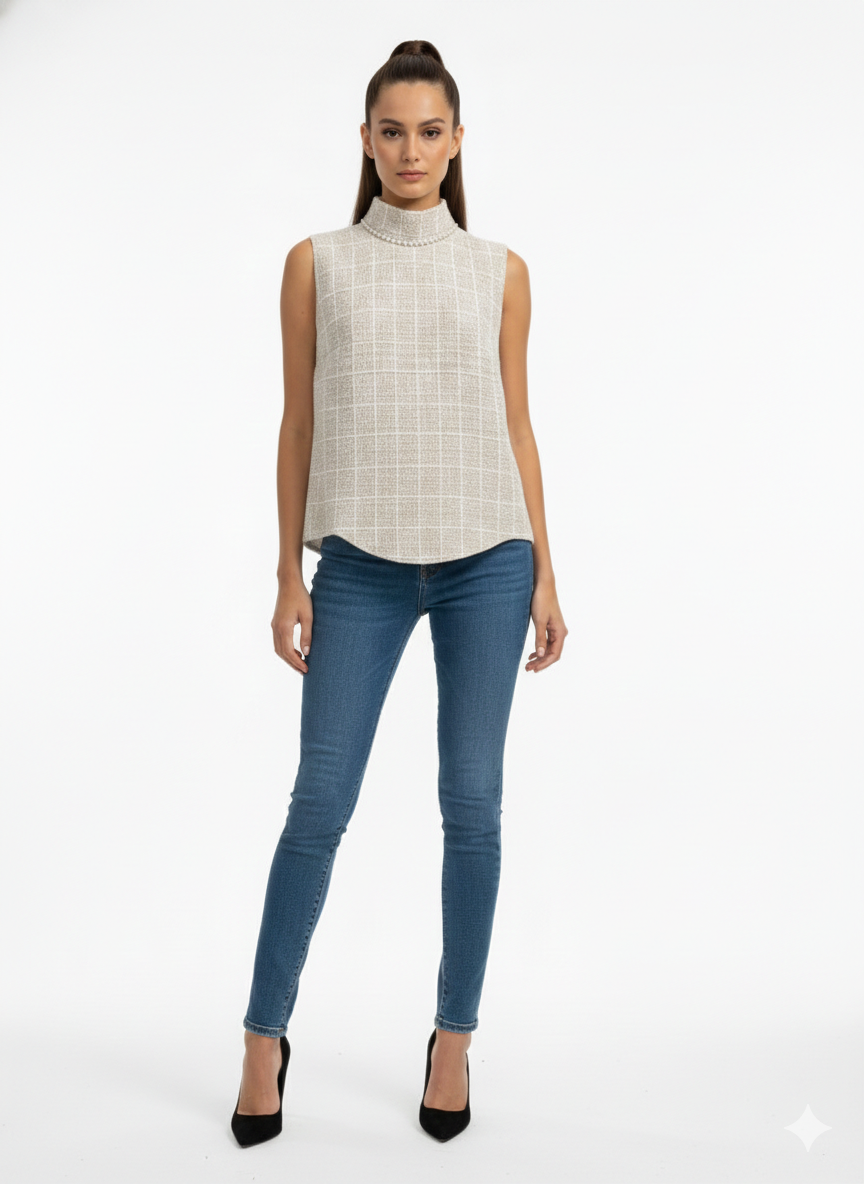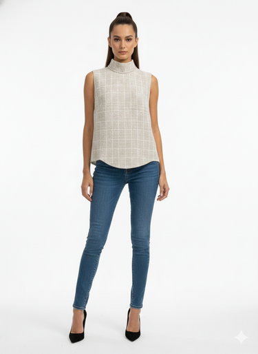 This elegant high-neck blouse is crafted from a refined textured tweed fabric, offering a timeless and sophisticated look. The structured silhouette sits beautifully on the body, while the subtle woven pattern adds depth and luxury to the design. A delicate row of pearl embellishments along the neckline creates a graceful focal point, elevating the blouse with a classic feminine touch. Perfect for formal occasions or elevated daywear, this piece pairs effortlessly with tailored trousers or skirts for a polished and chic ensemble.