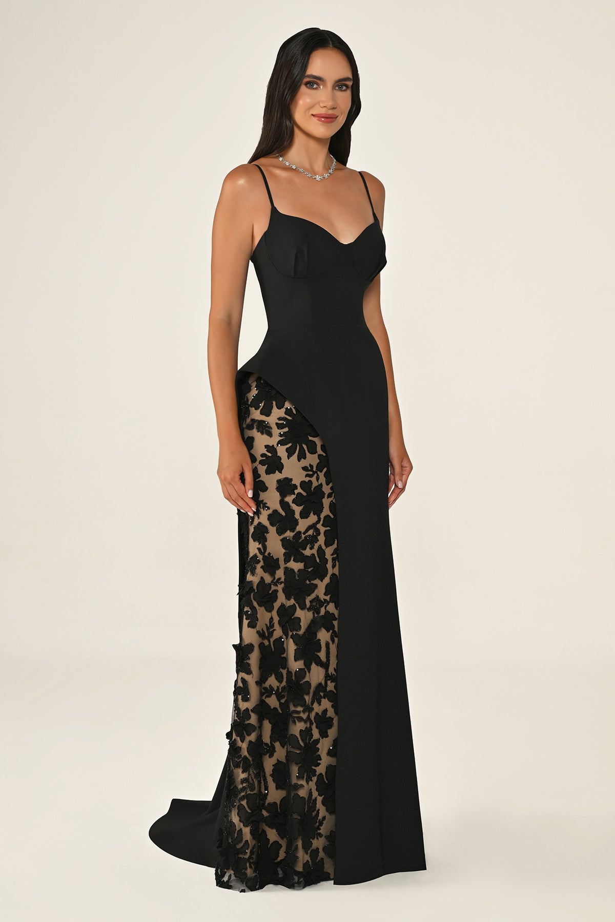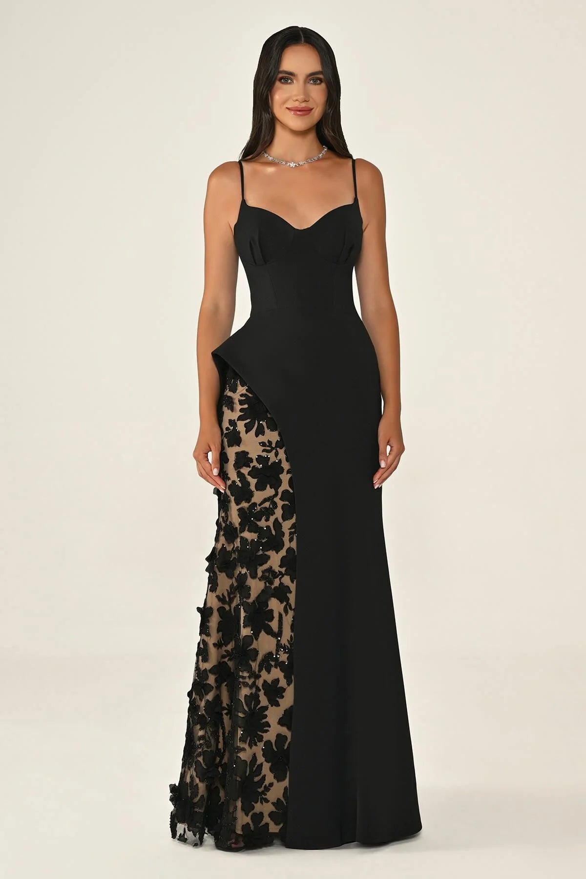 This elegant black evening gown features thin spaghetti straps and a structured sweetheart bodice. The asymmetrical design highlights a nude illusion lace panel adorned with black floral appliqué and sequins, adding a dramatic touch. The slim silhouette and floor-length finish create a refined, modern look perfect for formal occasions.