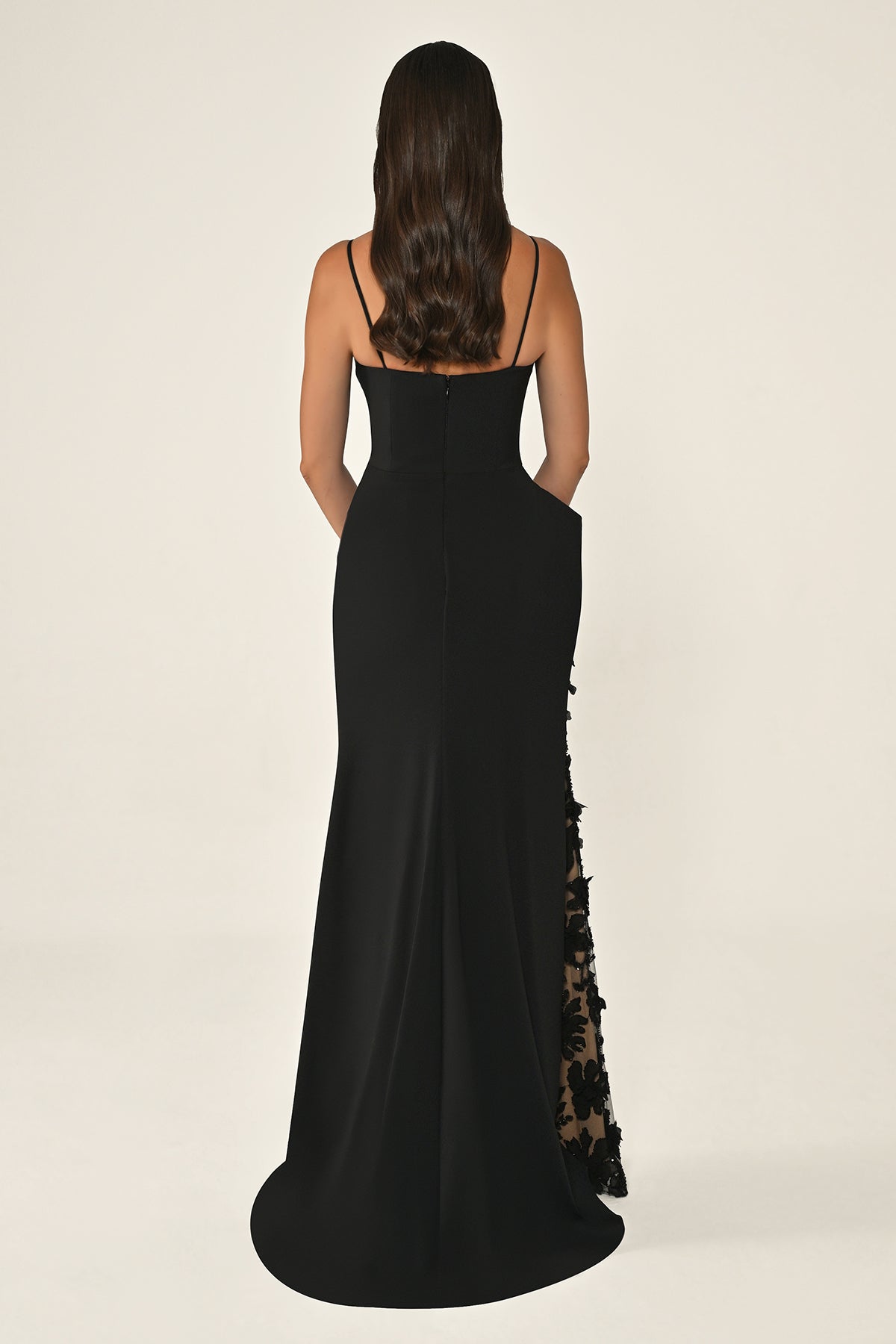 Black Spaghetti Strap Gown with Floral Lace Panel