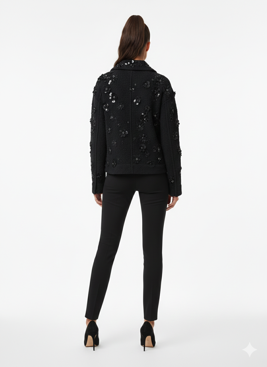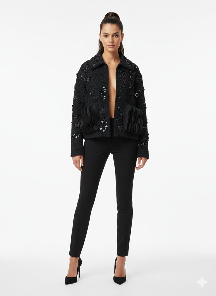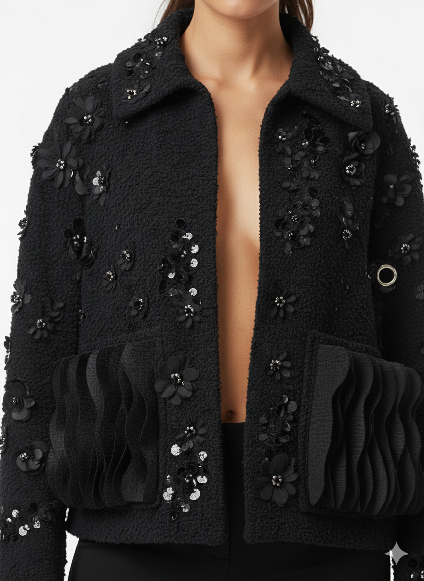 This statement black teddy jacket features a bold, textured silhouette enriched with intricate sequin-embroidered floral and leaf motifs throughout. Designed with a structured open-front style, it showcases a soft faux-fur collar that adds contrast and warmth. The standout layered pocket detailing at the front creates depth and a sculptural effect, while the relaxed fit allows for effortless layering. A perfect balance of elegance and edge, this jacket is ideal for evening wear or elevated casual styling.