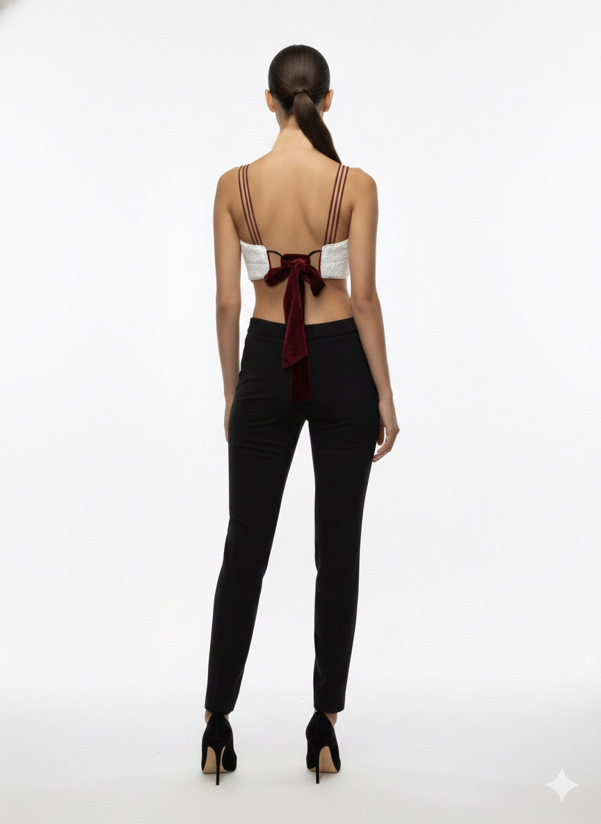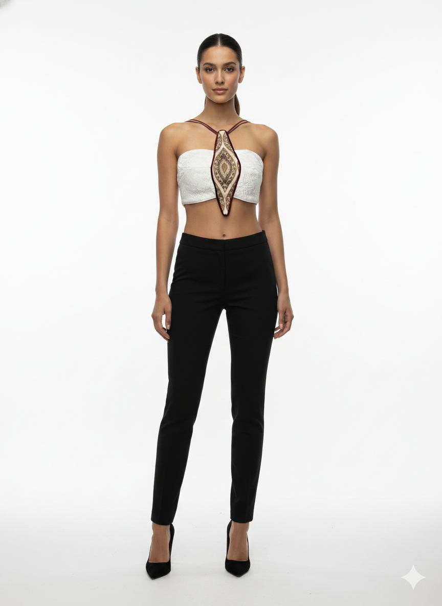 This elegant white statement top features a refined bandeau-style silhouette with a clean, structured fit that highlights the shoulders and neckline. The focal point is an inverted tulip-shaped embroidered panel at the front, adding a delicate yet striking artistic detail. Slim double straps extend over the shoulders, while the open-back design is finished with a soft velvet tie closure for an adjustable and feminine touch. Designed for elevated styling, this top pairs beautifully with tailored pants or skirts for evening occasions or modern statement looks.