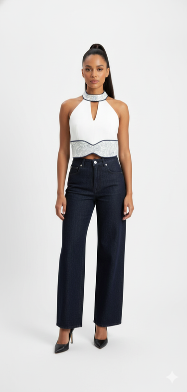 This elegant halter crop top features a crisp white body accented with delicate paisley embroidery at the neckline and hem. The high-neck halter design with a subtle front cut-out creates a refined yet modern silhouette, while the structured bodice offers a flattering, secure fit. A perfect statement piece that elevates both tailored pants and skirts for evening or chic daytime styling.