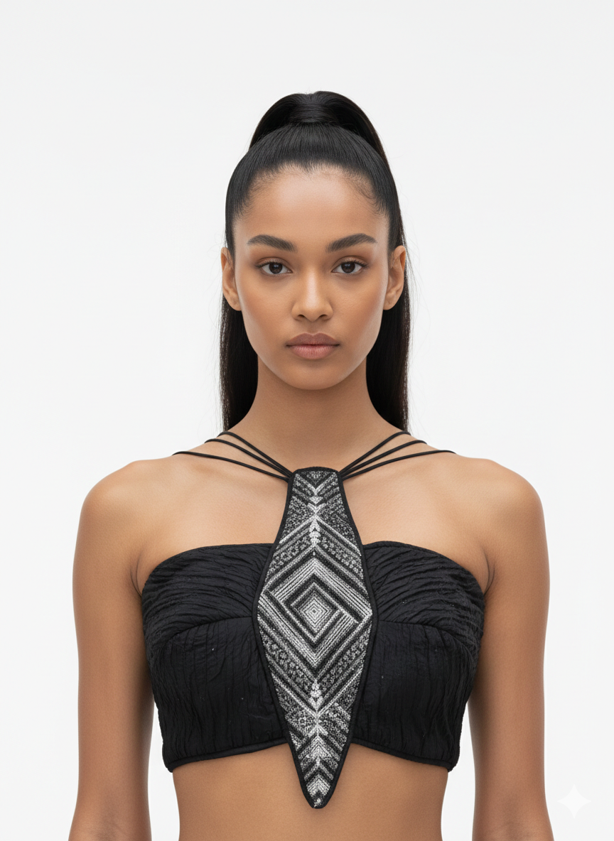 This striking black statement top is designed to stand out with its bold yet elegant silhouette. Featuring a bandeau-style bodice, it highlights the shoulders and neckline while maintaining a refined, structured fit. The centerpiece is an elongated geometric embroidered panel at the front, adding a strong artistic and modern edge. Delicate multi-strap detailing frames the neckline, while the open-back design with adjustable tie closure enhances both fit and visual appeal. Perfect for evening styling or fashion-forward occasions, this top pairs effortlessly with skirts or tailored pants.