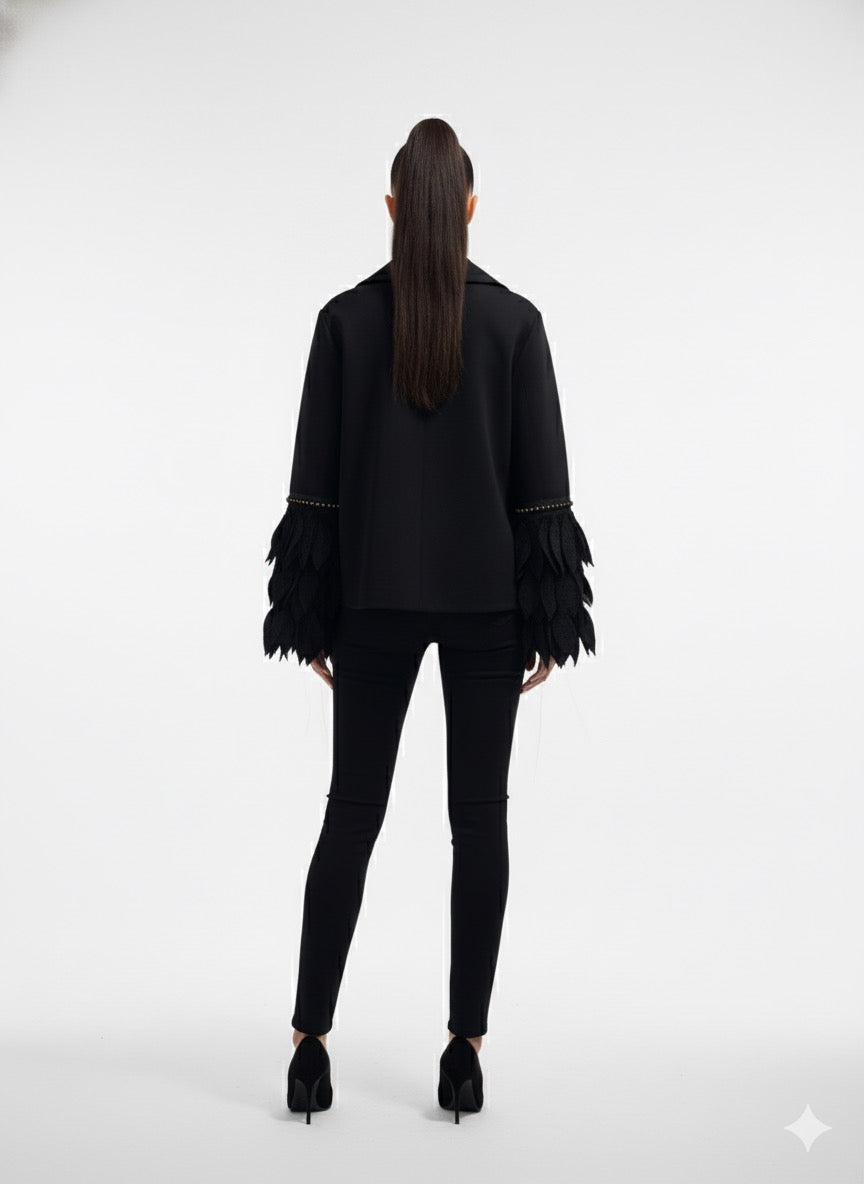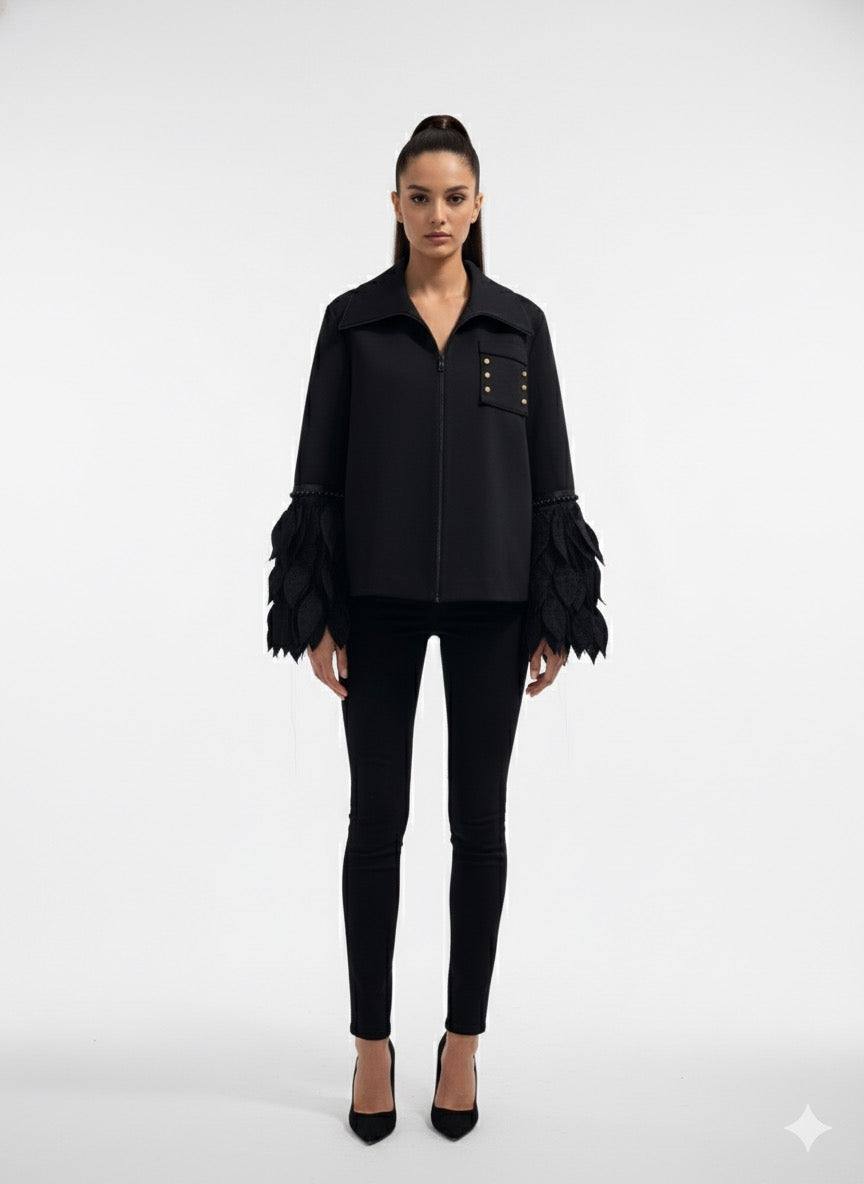 Refined yet avant-garde, this black statement coat brings together minimalism and couture craftsmanship. The structured silhouette features a zip-front closure and a bold chest pocket with gold-tone button accents, adding a touch of sophistication. The dramatic feather-inspired appliqué sleeves elevate the look, creating a fluid sense of movement and artistic flair. Designed for both day and night elegance, this piece redefines modern luxury with a daring edge.