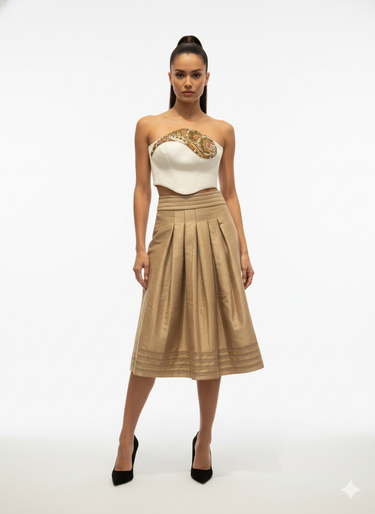 This elegant midi skirt features a timeless A-line silhouette with structured pleats that create graceful movement and a flattering shape. Designed with a high-waisted fit, it accentuates the waist while offering a refined, feminine flow through the skirt. The subtle horizontal detailing near the hem adds depth and a tailored finish. Perfectly versatile, this skirt pairs beautifully with fitted tops, blouses, or corset-style pieces for both day-to-evening styling.