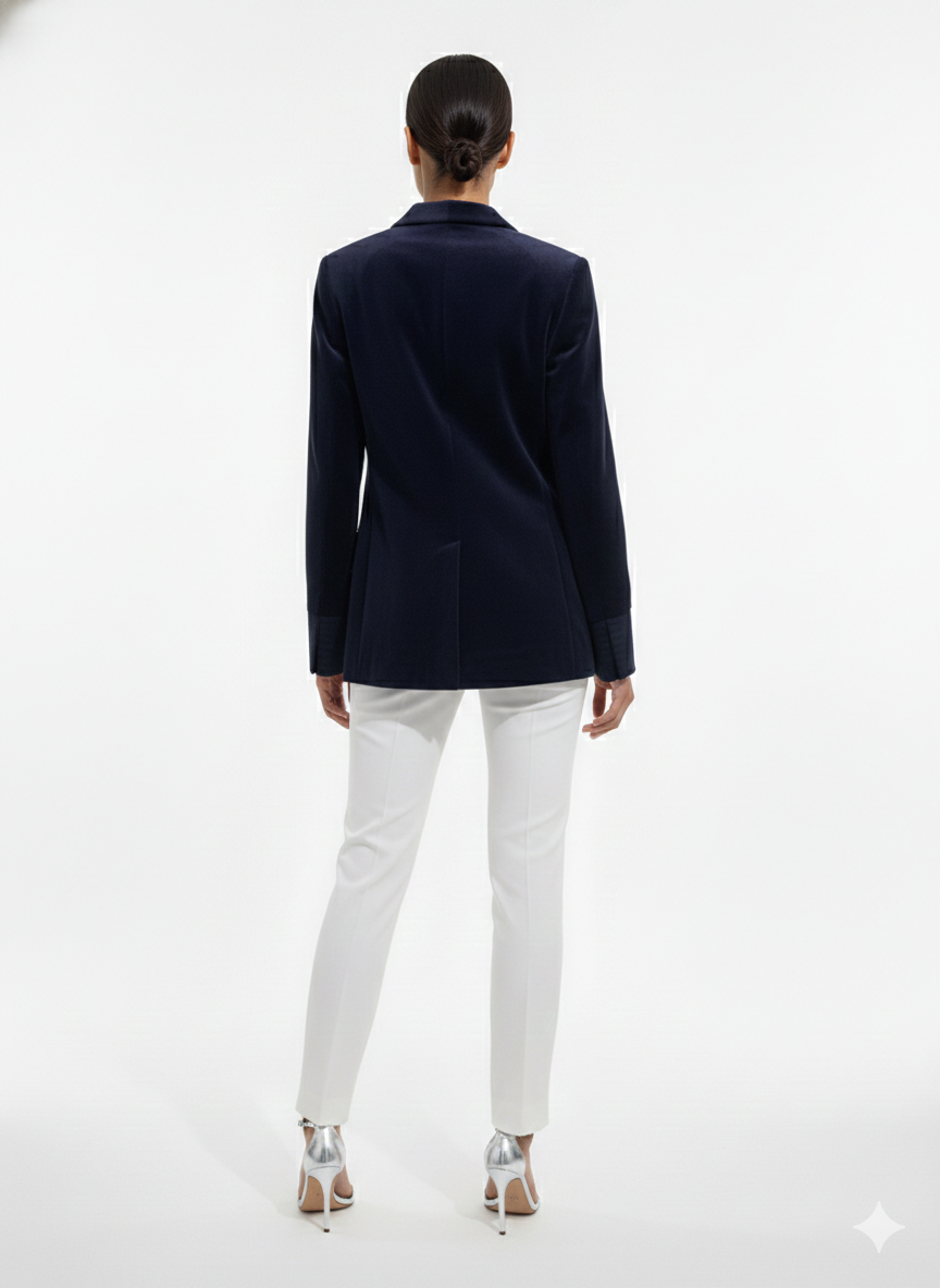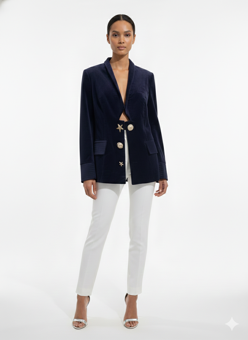 This luxurious navy velvet coat blends classic tailoring with statement embellishment for a refined yet bold look. Designed in a sleek, structured silhouette, it features a deep open front that elongates the neckline and enhances layering versatility. The front panel is adorned with striking gold decorative elements inspired by marine motifs and textured medallions, adding artistic dimension and contemporary elegance. Sharp lapels and clean lines maintain a polished finish, while the smooth velvet fabric offers a rich, soft touch. Perfect for elevated evening styling, formal gatherings, or sophisticated outerwear layering, this piece embodies modern glamour with timeless appeal.