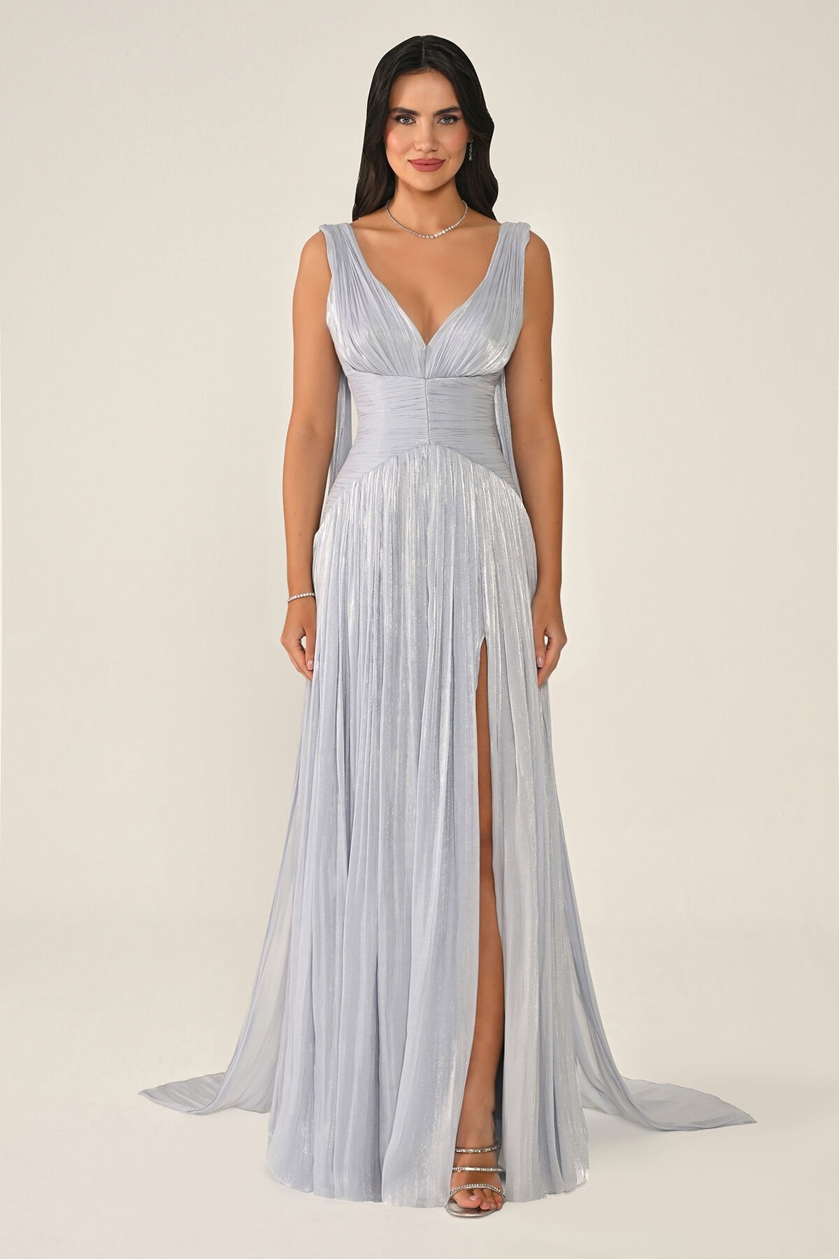 Description: Elegant evening dress in a luminous Gray tone, designed with delicate pleating that flows beautifully with every step. The deep V-neckline and structured waist create a flattering silhouette, while the soft drape of the skirt adds movement and sophistication. A high slit introduces a modern, refined edge, making it a perfect choice for formal events and special occasions.