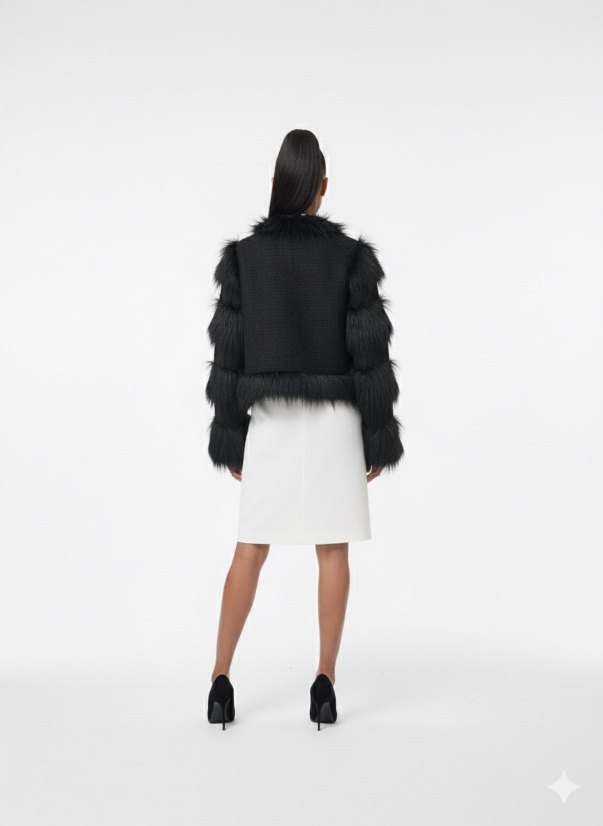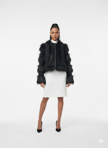 This luxurious black faux fur coat features alternating textured and plush panels, offering both warmth and high-end style. The structured silhouette with a straight cut provides an elegant fit, while the front hook closure adds a refined touch. Perfect for evening events or elevating any casual outfit, this coat brings together sophistication and bold fashion flair.