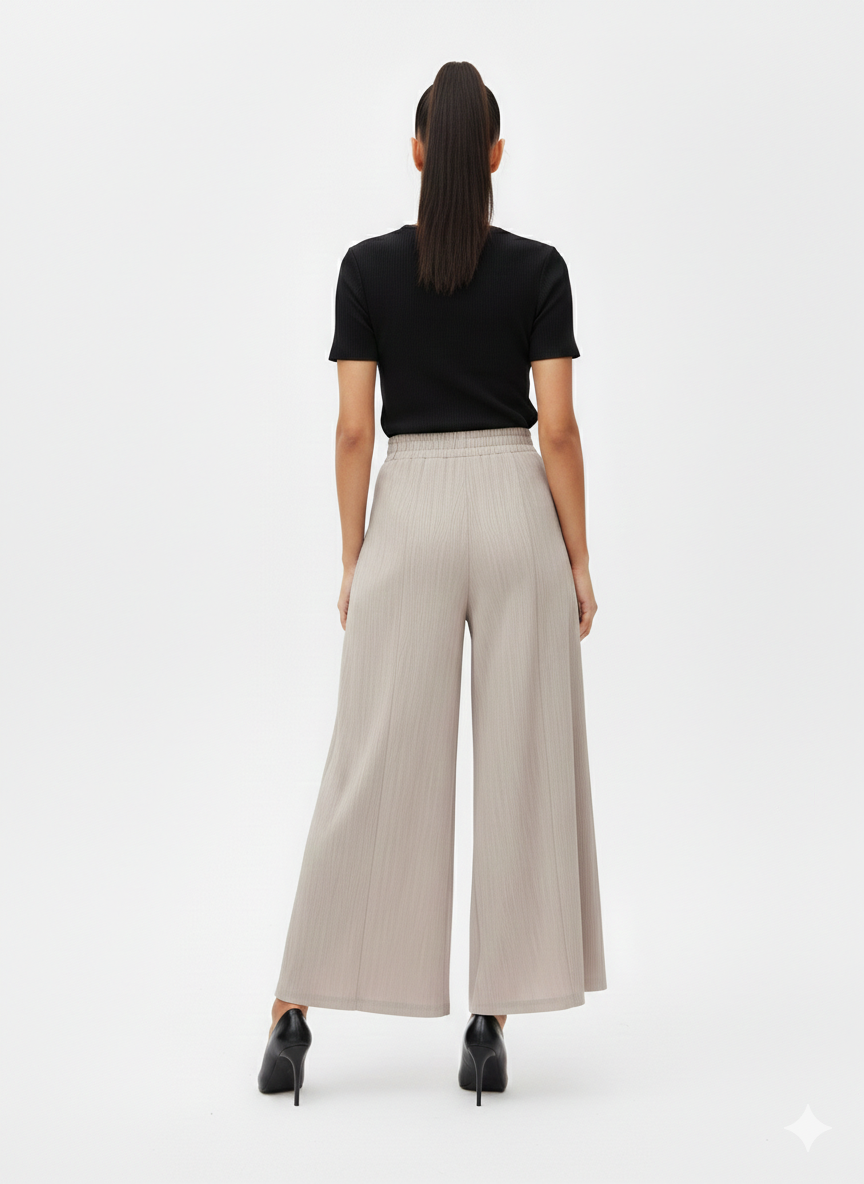 These refined cream wide-leg pants feature a high-waisted silhouette designed to elongate the legs and create a clean, elegant line. Crafted with a softly textured fabric, the pants include subtle pleated detailing at the hip area that adds structure and visual interest without bulk. The wide-leg cut offers fluid movement and a relaxed yet polished feel, making them ideal for both elevated everyday wear and sophisticated occasions. Easy to style with fitted tops or blouses, these pants deliver effortless elegance and comfort.