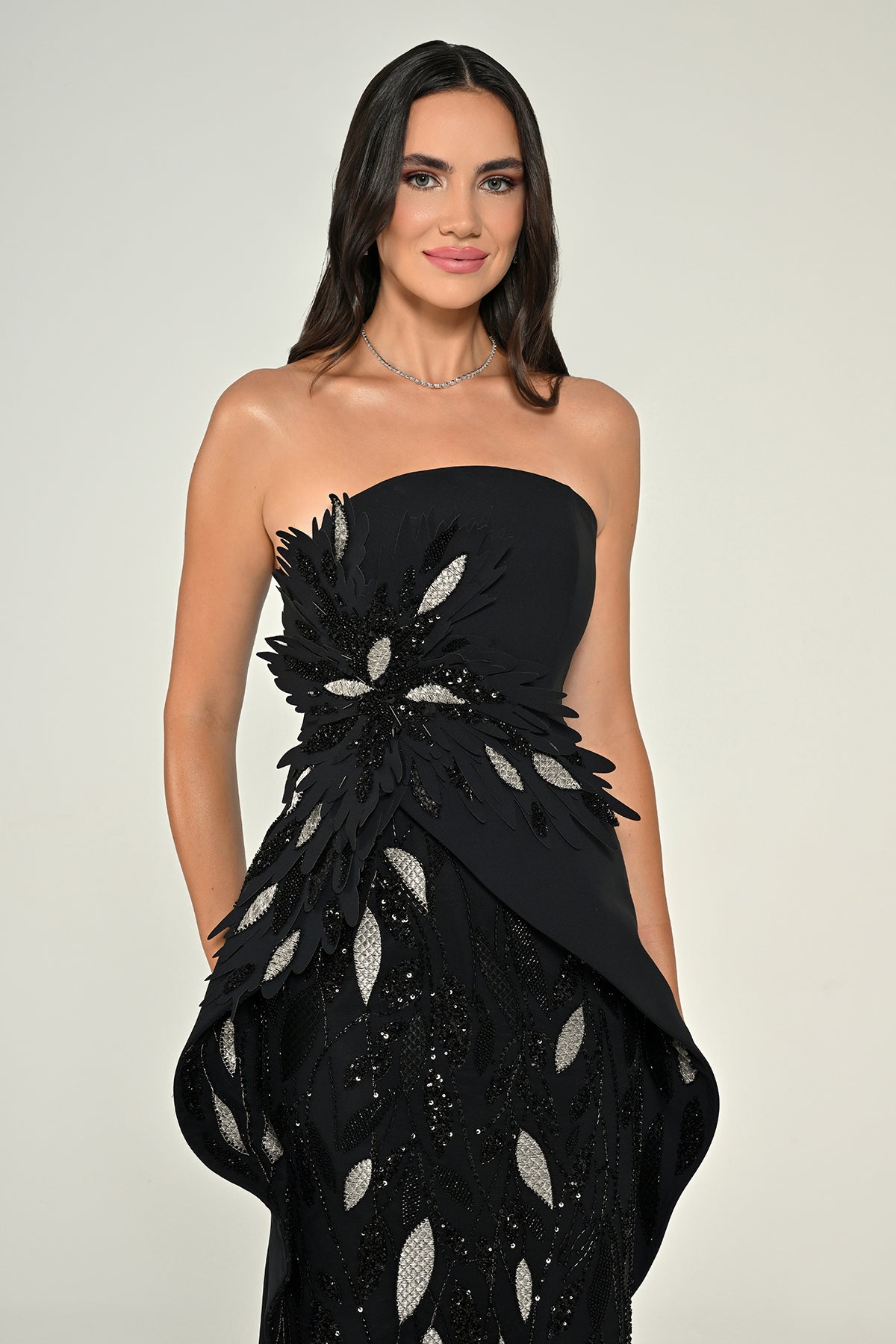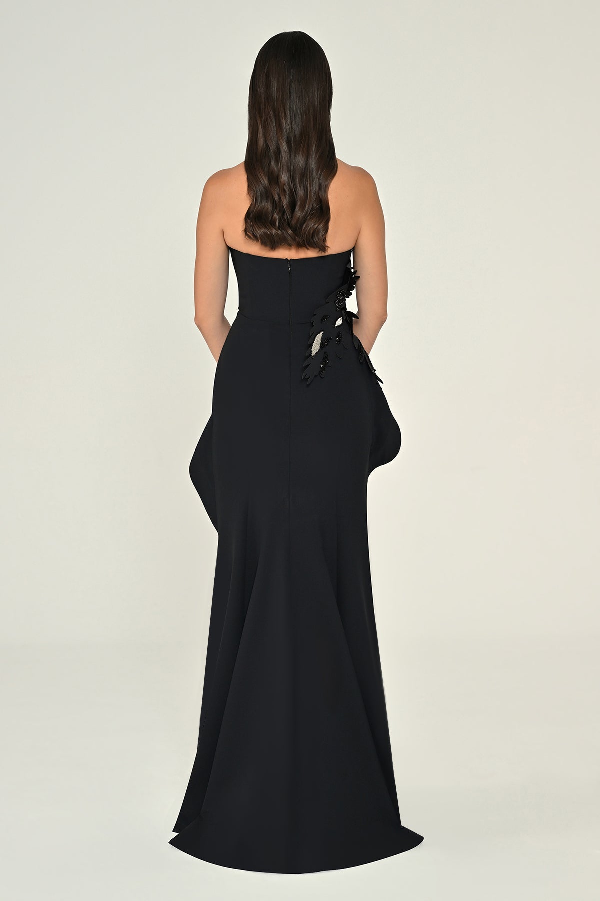 Asymmetrical draped detail at the waist for a sculpted silhouette